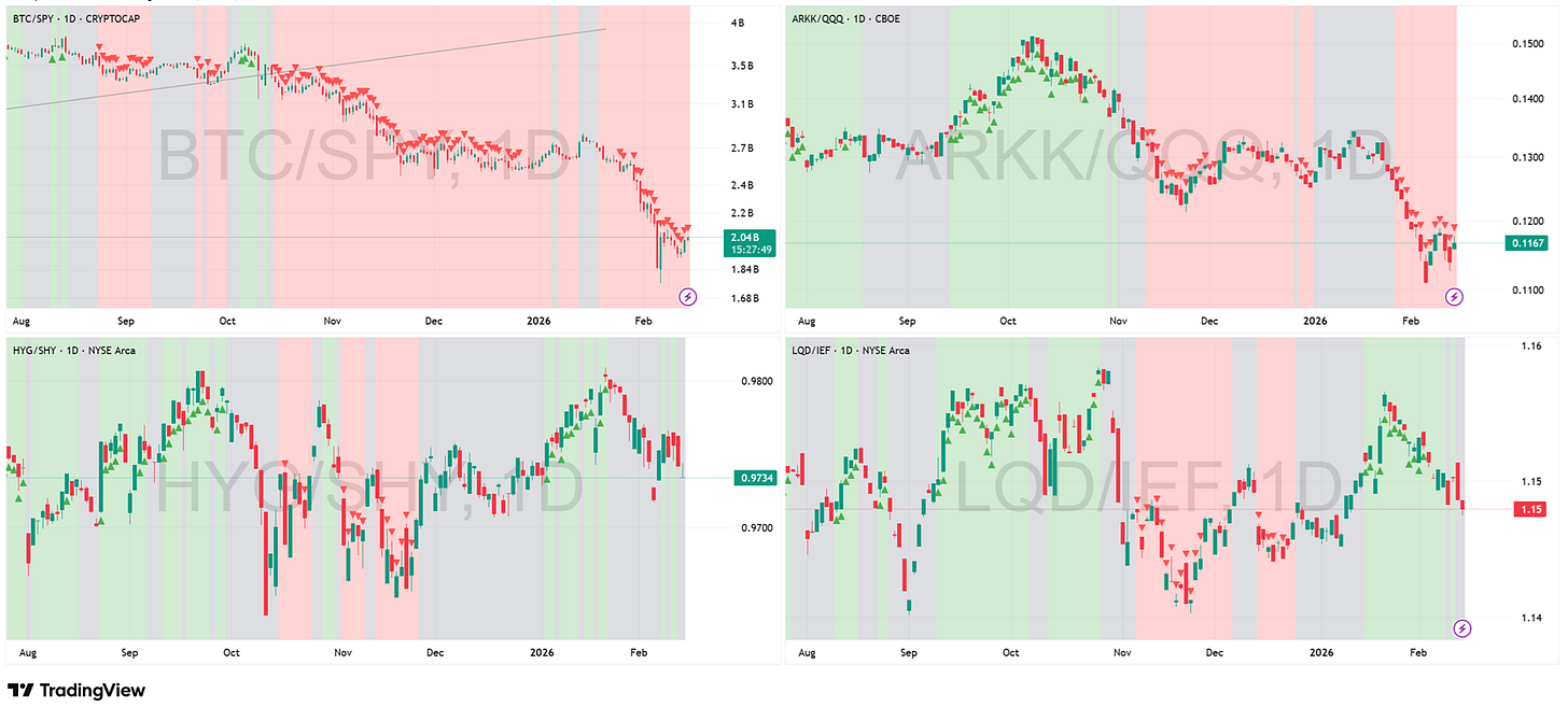 Key Development This Week: The “infection” has breached the containment wall. We warned last week that Investment Grade credit (LQD/IEF) was showing fatigue; this week, the dam broke. The ratio has lost its Green regime and collapsed into Gray. This is a critical escalation. It means the liquidity drain is no longer just punishing “reckless speculation” (BTC and ARKK remain in deep, catastrophic Red trends); it is now forcing liquidation in high-quality corporate paper. When even “safe” corporate bonds cannot outperform Treasuries, it signals a systemic tightening of financial conditions. The chart for LQD/IEF looks particularly ugly, with heavy selling pressure suggesting institutions are raising cash by selling what they can, not just what they want to.