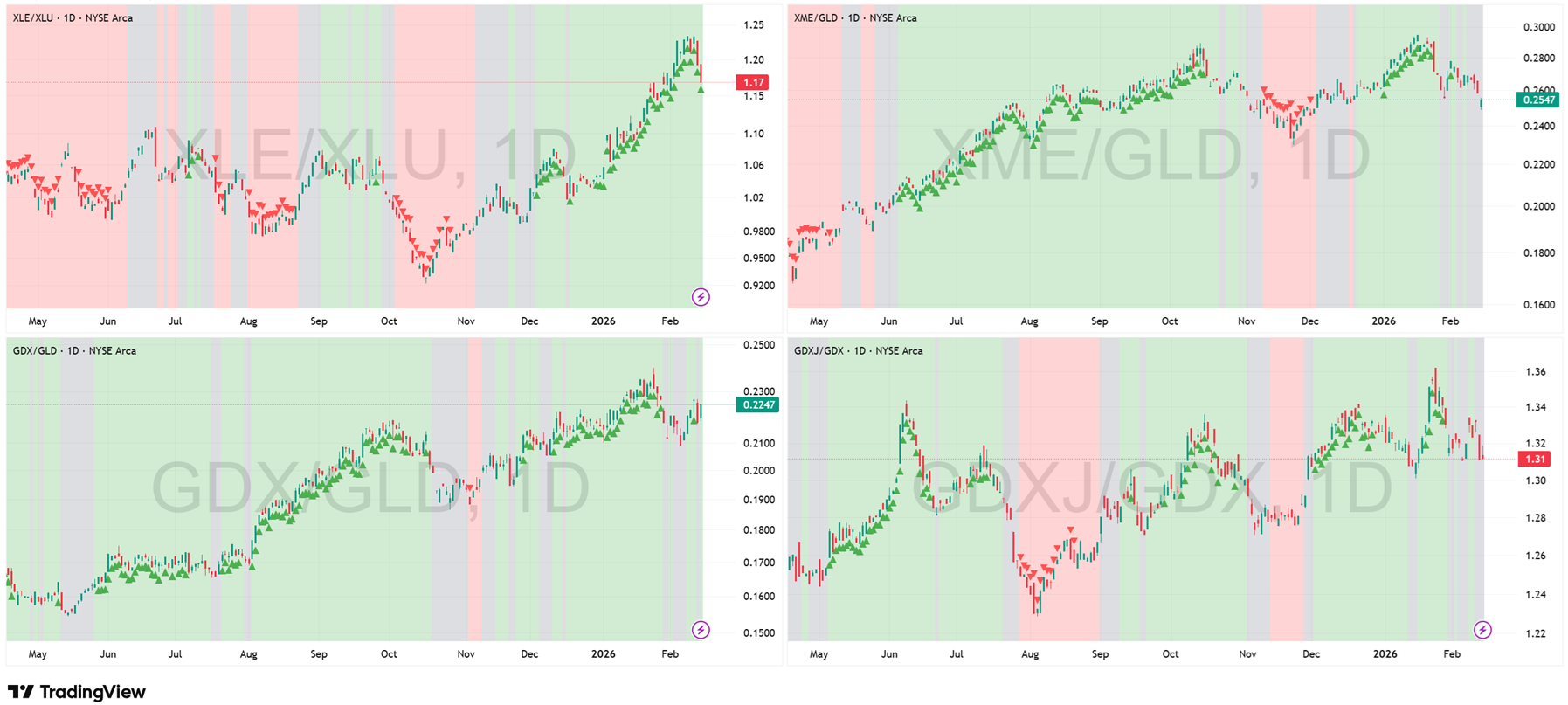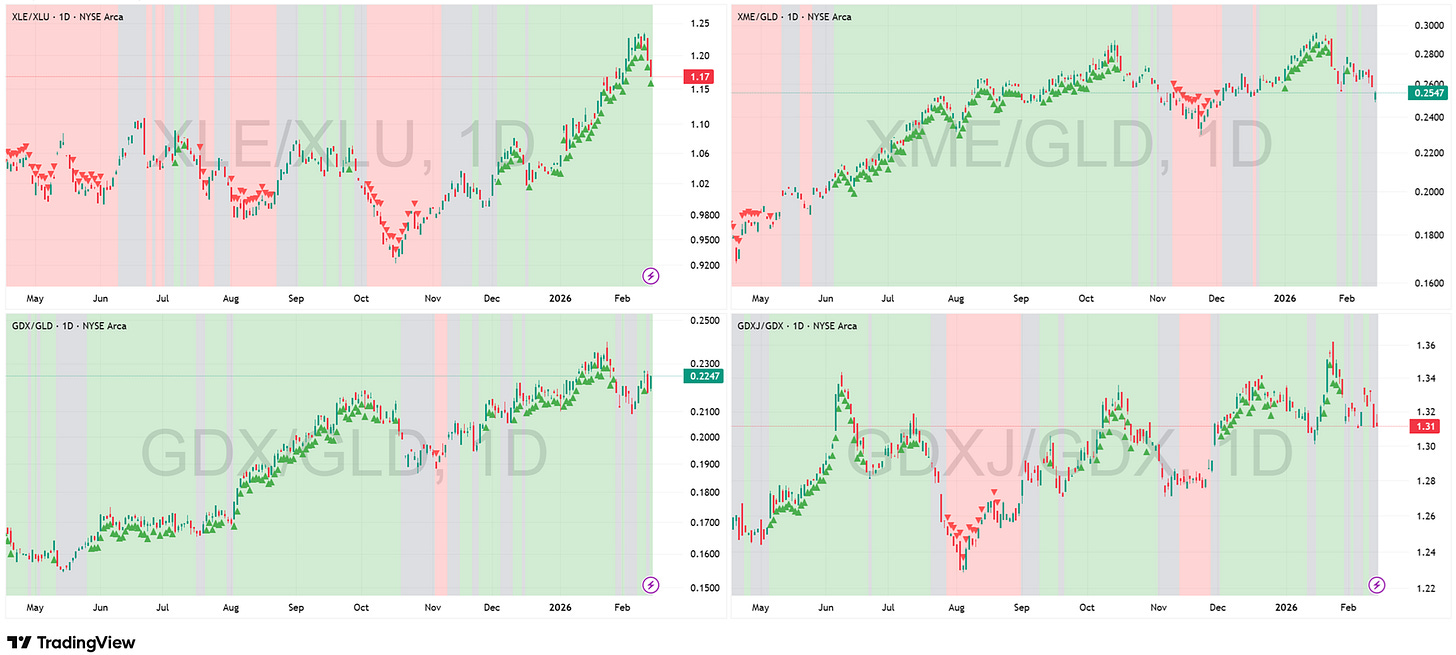 Key Development This Week: The Reflation trade has collided with the “Flight to Safety.” XLE/XLU remains in a Green regime, but the ratio has suffered a sharp pullback. Crucially, this is not because Energy (XLE) is broken—structural oil demand remains intact. The drop is driven entirely by the denominator: the panic-buying of Utilities (XLU) we identified in the Industrial block. Meanwhile, XME/GLD is stalling, not failing. After a powerful impulsive run, Industrial Miners are digesting gains in a lateral Gray consolidation. This is a technical pause to work off overbought conditions, not a reversal of the trend. Gold Miners (GDX, GDXJ) remain the laggards, stuck in choppy Gray action.