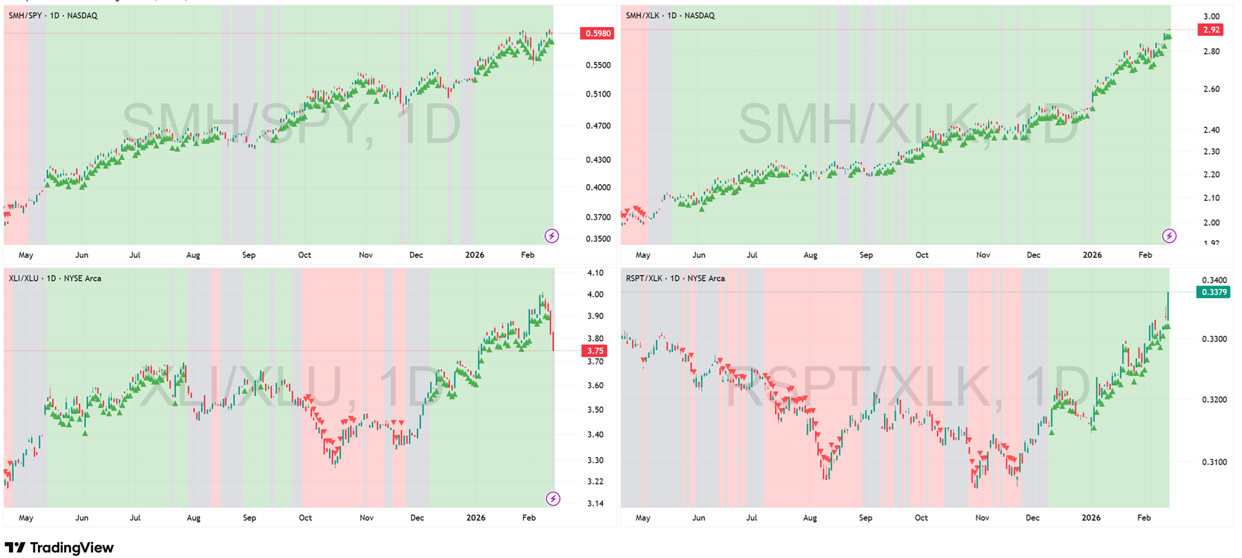 Ratios: SMH/SPY, SMH/XLK, XLI/XLU, RSPT/XLK