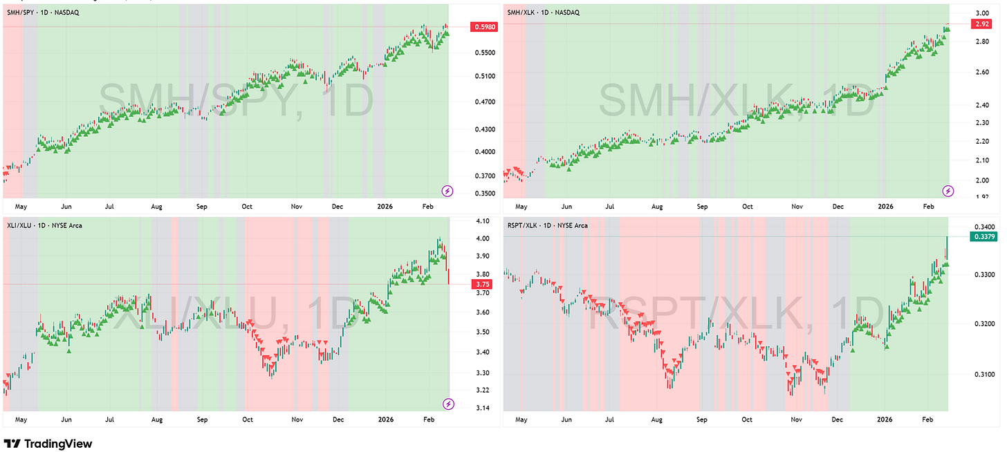 Key Development This Week: The “Fortress” stands, but with a distinct defensive twist. The Tech complex is being driven by a violent “Hardware over Software” rotation. The vertical spikes in RSPT/XLK and SMH/XLK are heavily influenced by the Software Crash (the denominator is falling), masking the fact that breadth within tech is actually quite narrow. Crucially, the drop to Gray in XLI/XLU is not a signal of Industrial weakness. XLI remains structurally sound. The ratio is being compressed by an explosive breakout in Utilities (XLU), mirroring the defensive flight to safety we saw in Staples (XLP). This is a “Denominator Event,” not a trend change in the physical economy.
