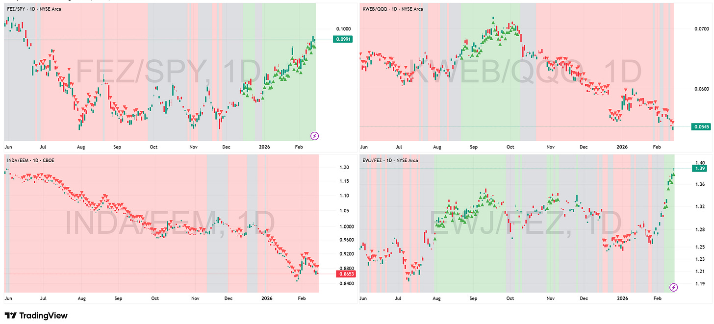 Key Development This Week: The hierarchy of global capital is brutally clear. While FEZ/SPY (Europe vs. USA) remains a solid Green trend, confirming the structural flow out of American assets, the torch of leadership has been passed. EWJ/FEZ (Japan vs. Europe) has gone vertical. This is now the “Best of the Best” chart on the board.