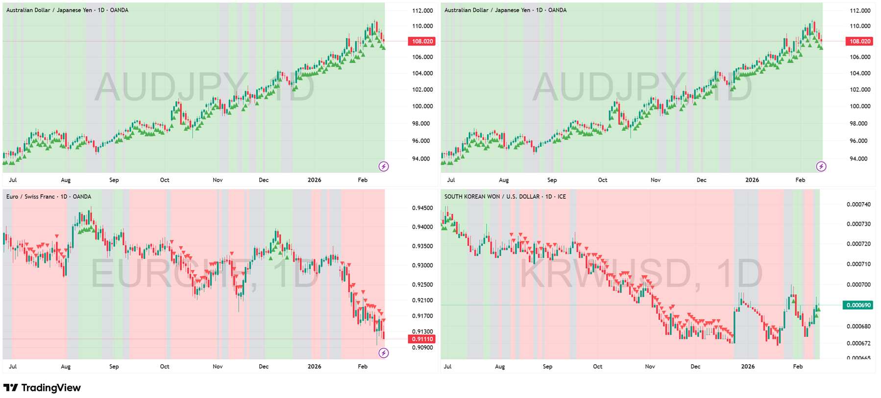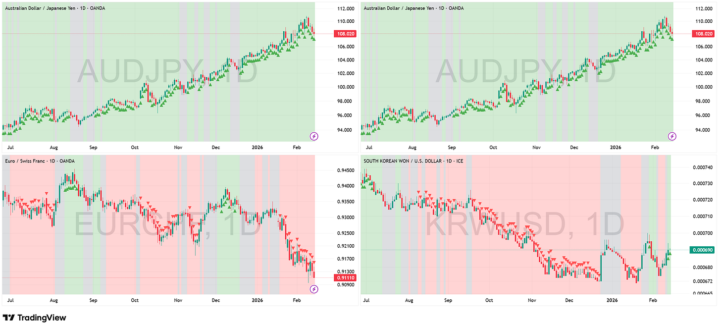 Key Development This Week: The “Risk-On” signal from the currency market is flashing a warning. While AUD/JPY and CAD/JPY remain in Green regimes, the price action is becoming highly suspicious. Instead of accelerating, the Carry Trade is stalling at the highs, leaving “topping tails” that suggest exhaustion. If we do not get immediate trend continuation here, the entire leverage construct supporting the equity rally is in danger. Meanwhile, a surprise shift has occurred in KRW/USD (Korean Won). It has flipped back to Green, offering a tentative sign of life for the global industrial cycle. However, this is not a breakout yet; it is merely chopping within a range. EUR/CHF remains deep Red, confirming that European traders are still buying “Crash Protection” (Francs) despite the equity rally.