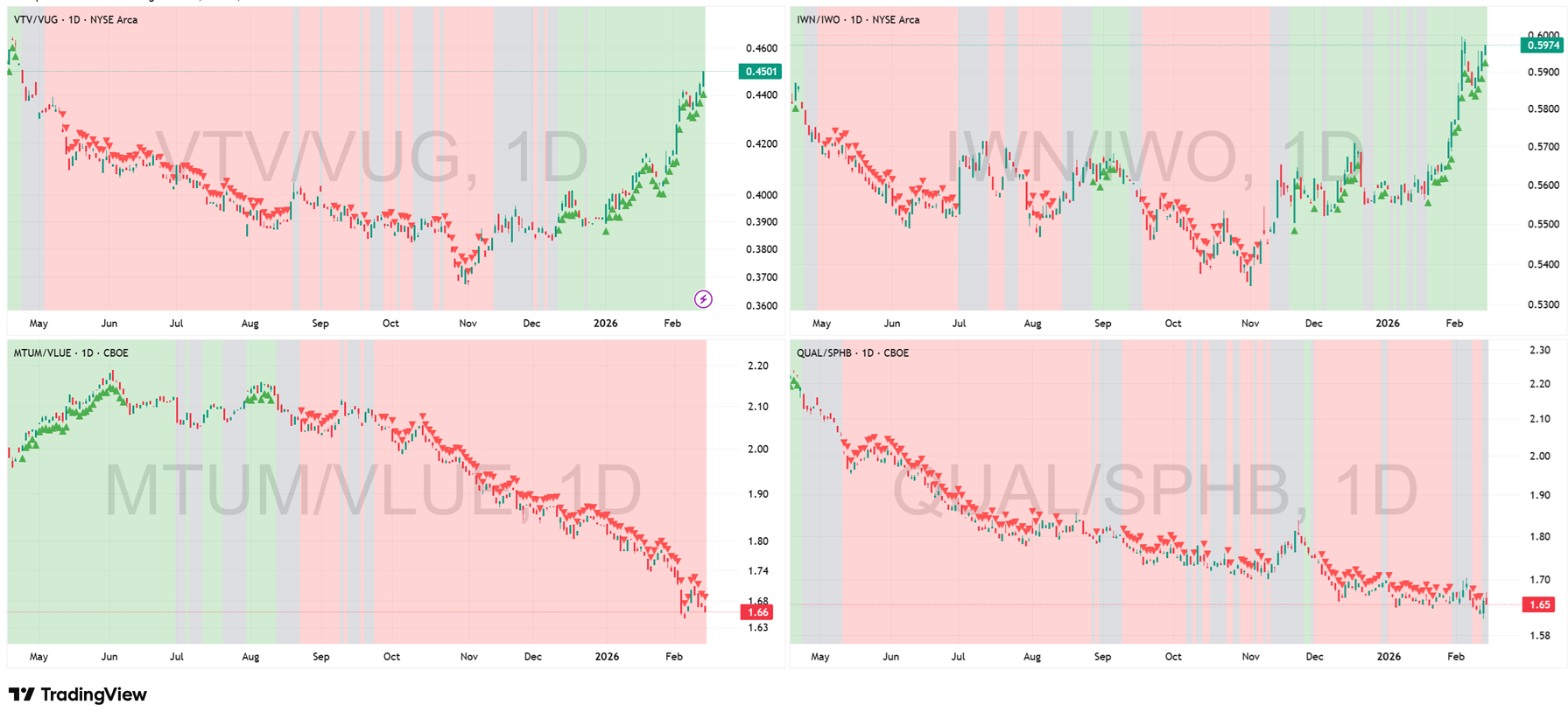 Ratios: VTV/VUG, IWN/IWO, MTUM/VLUE, QUAL/SPHB