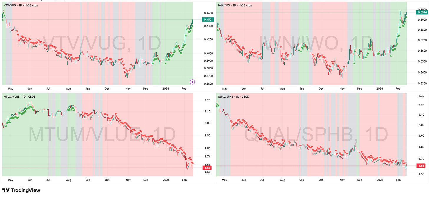 Key Development This Week: The rotation has turned into a rout. The “Value” factor is not just outperforming; it is actively destroying Growth. VTV/VUG (Large Value) and IWN/IWO (Small Value) are vertical in deep Green trends, confirming that capital is aggressively fleeing “expensive perfection” to buy “cheap cash flow.” The collapse in MTUM/VLUE (Momentum vs. Value) to fresh lows confirms that “Winners” of the past year are now the primary funding source for this rotation. However, note the nuance in QUAL/SPHB (Quality vs. High Beta). It remains stuck in Gray. Investors are buying Value, but they are not blindly buying “Junk.” They are rotating into cheaper assets but retaining a preference for Quality over pure speculative High Beta.