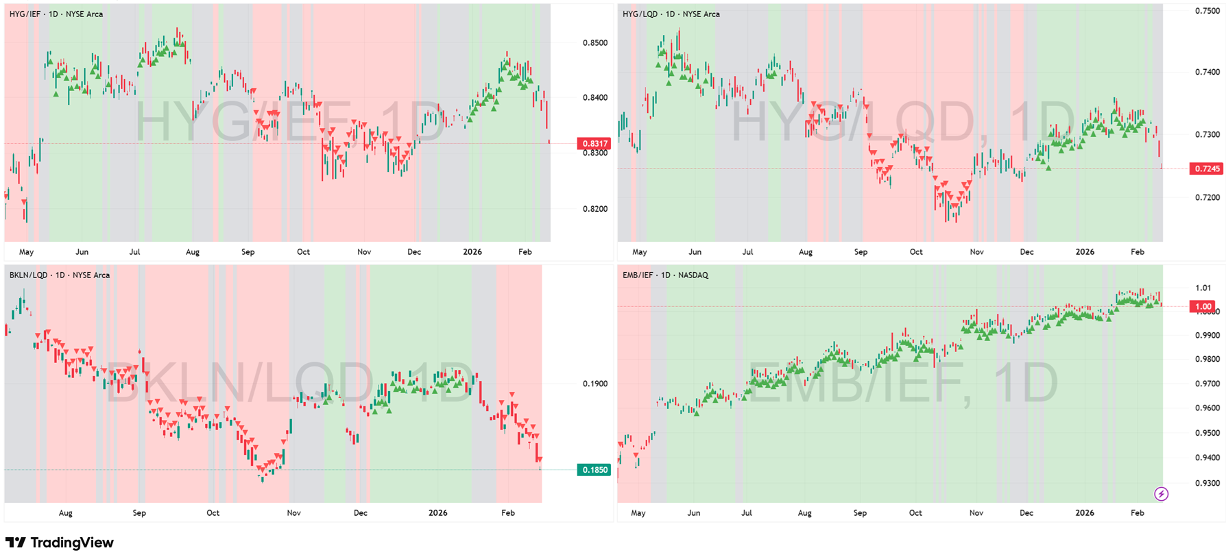 Key Development This Week: The “fatigue” we warned about last week has officially turned into a breakdown. The credit market has moved to a “Risk-Off” footing. Both HYG/IEF and HYG/LQD have lost their Green regimes and flipped to Gray. This is a major structural shift. It means High Yield corporate bonds are no longer generating alpha over Treasuries or Investment Grade debt. The “Carry Trade” is effectively dead. BKLN/LQD (Bank Loans) remains a disaster zone in deep Red, confirming the market hates floating rate risk. The only survivor is EMB/IEF (Emerging Markets), which remains Green, but the price action has turned ugly and volatile. It is now an isolated island of risk in a sea of defensive rotation.