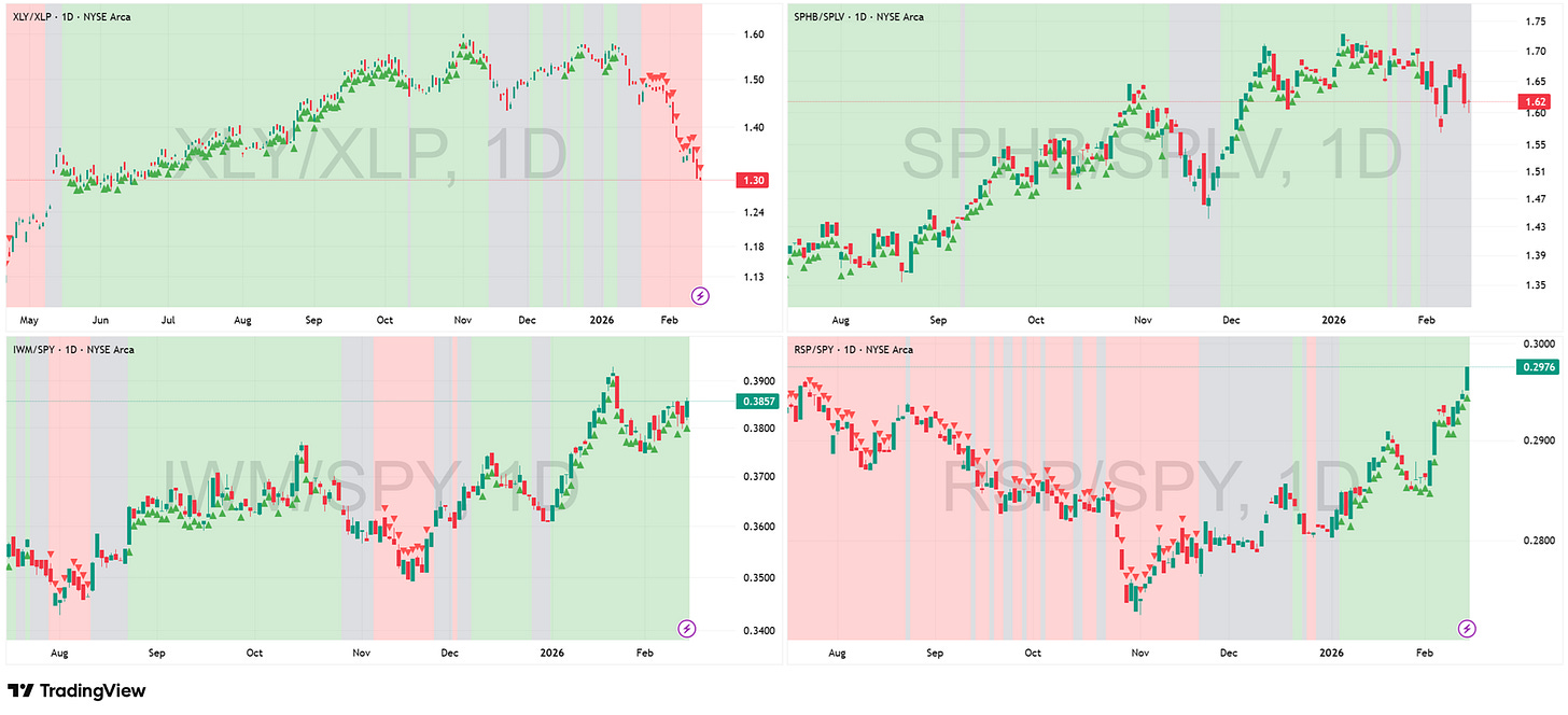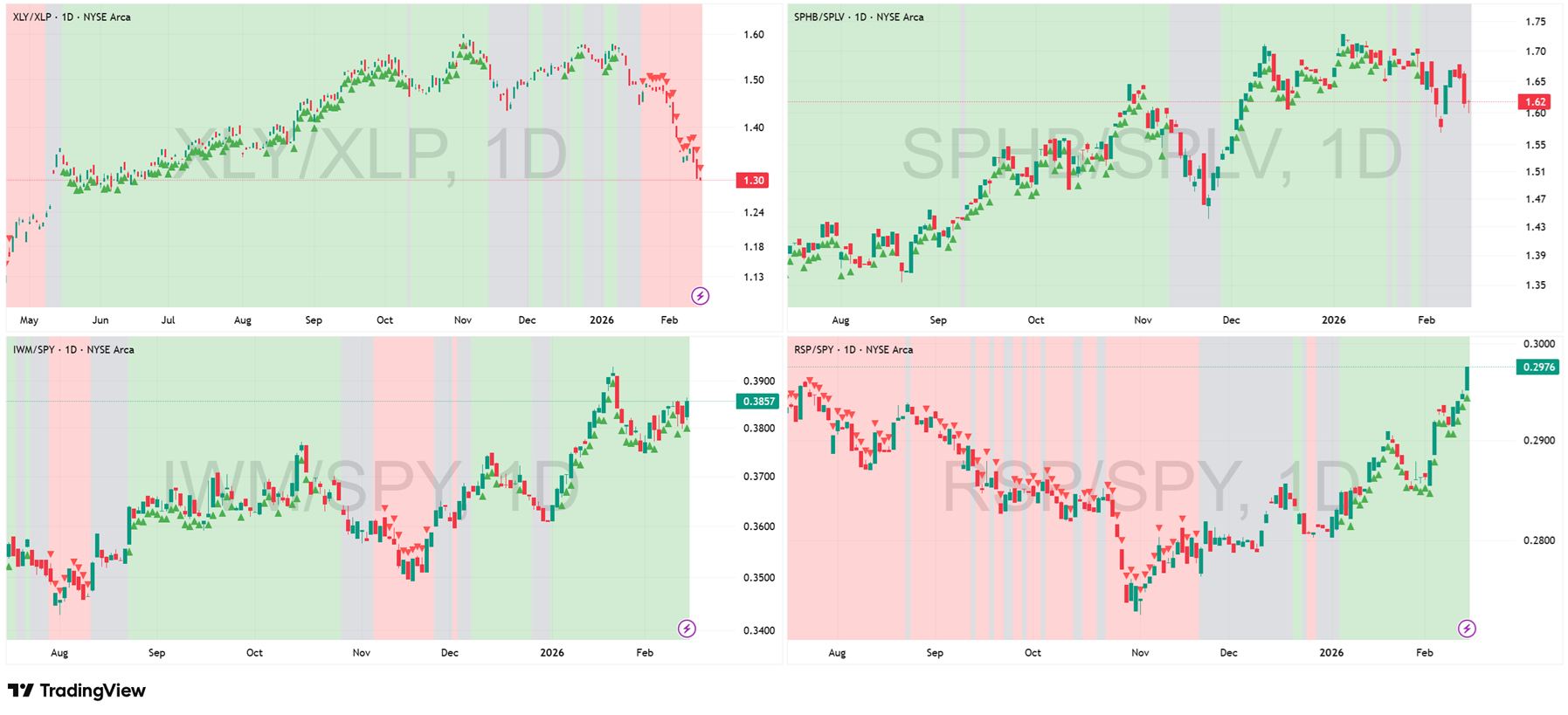 Ratios: XLY/XLP, SPHB/SPLV, IWM/SPY, RSP/SPY