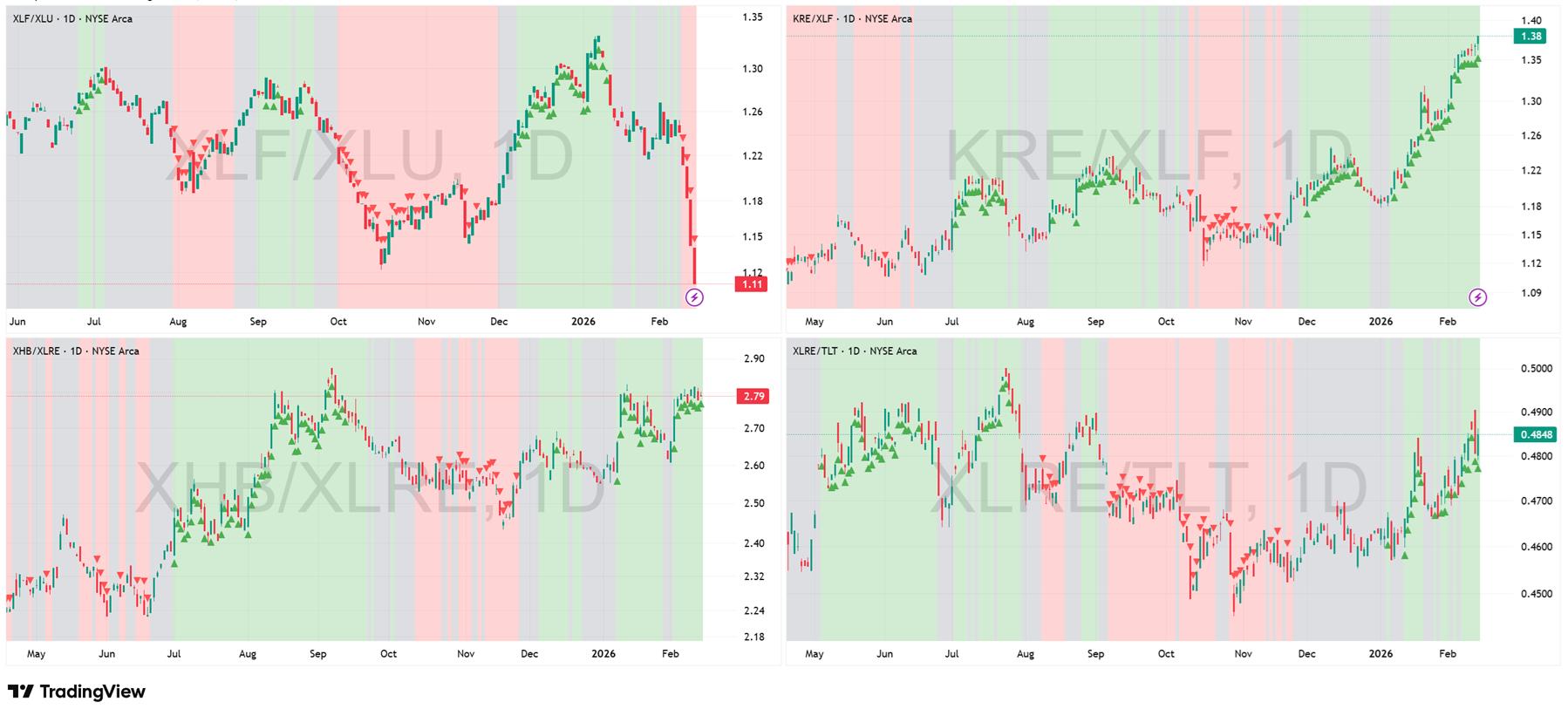 Ratios: XLF/XLU, KRE/XLF, XHB/XLRE, XLRE/TLT