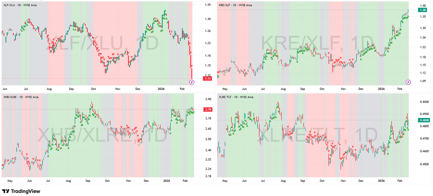 Key Development This Week: A massive divergence has torn the Financial sector apart. XLF/XLU (Financials vs. Utilities) has been completely annihilated, crashing vertically into a deep Red regime. This is not just a “denominator” issue driven by the Utility squeeze; the large-cap Financials (XLF) are facing liquidation. However, a miraculous decoupling is happening: KRE/XLF is skyrocketing in a vertical Green impulse. Regional Banks (KRE) are ignoring the sector-wide rot, rallying in both relative and absolute terms. They are the only “Rate Sensitive” vehicle showing genuine demand. Meanwhile, the “Real Asset” trade holds firm, with XHB/XLRE (Homebuilders) and XLRE/TLT (Real Estate vs. Bonds) maintaining their Green trends despite the volatility.