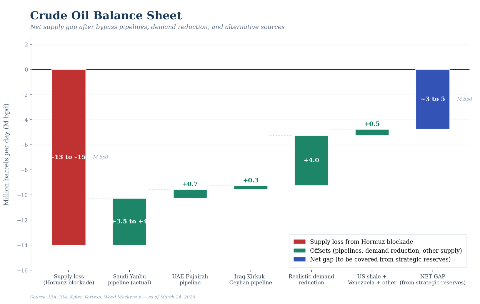 The first reason is bypass capacity. Saudi Arabia can reroute about 3.5 to 4.0 million barrels per day through Yanbu, the UAE can add about 0.7 million through Fujairah, and Iraq can contribute around 0.3 million through Kirkuk-Ceyhan. So if the crude disruption is roughly 13 to 15 million barrels per day, the pipelines bring that down to about 8 to 10.5 million.